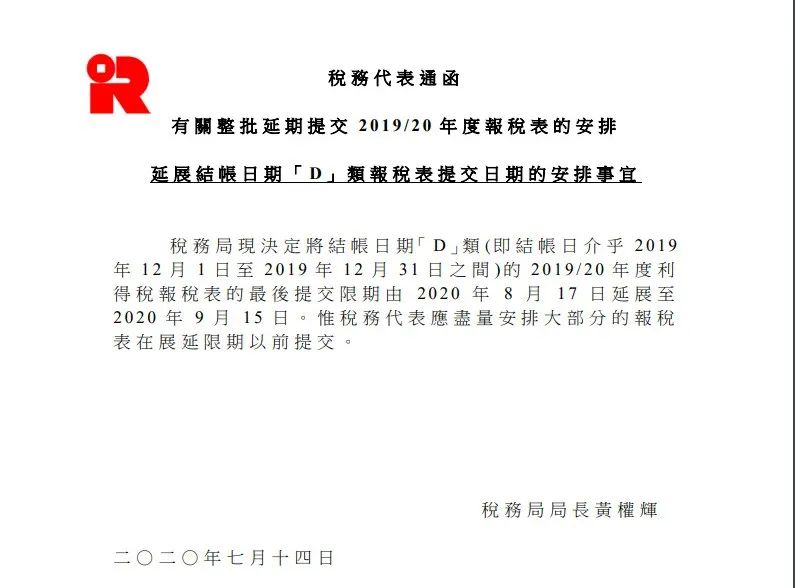 決定2019/20年度利得稅稅表的最后限期由原來的2020年8月17日延期至9月15日。