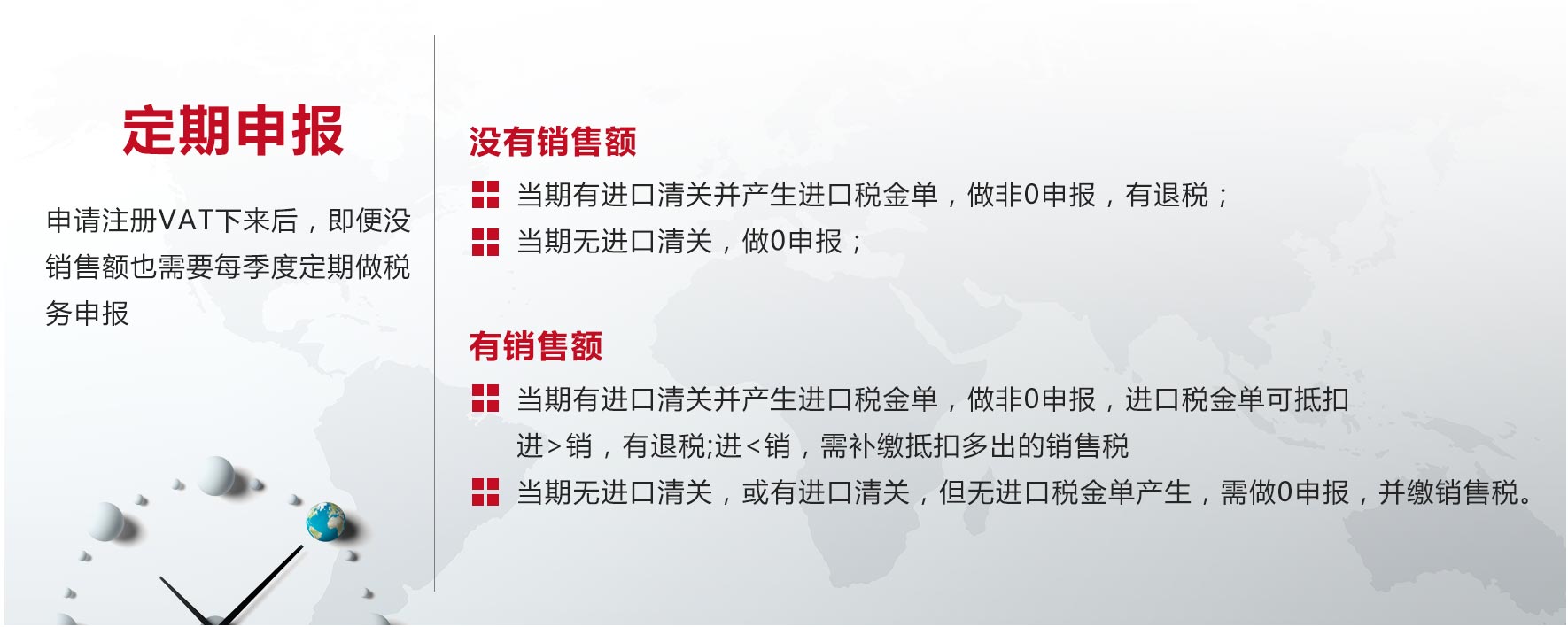 a. 申請注冊VAT下來后,即便沒銷售額,也需要每季度定期做稅務(wù)申報,可選擇由代理代為申報或自行申報;