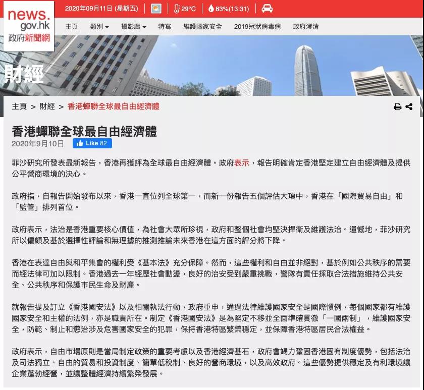 “ 加拿大菲沙研究所(Fraser Institute)2020年9月10日發(fā)表《世界經(jīng)濟自由度2020年度報告》,再次將香港評為全球最自由的經(jīng)濟體。”