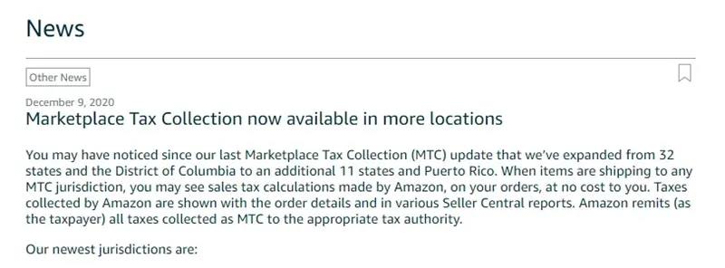 近日,亞馬遜美國(guó)站發(fā)布了一則有關(guān)在更多地區(qū)商城征稅(Marketplace Tax Collection)的公告,新增了11個(gè)需要由亞馬遜代收代繳銷(xiāo)售稅的地區(qū)。
