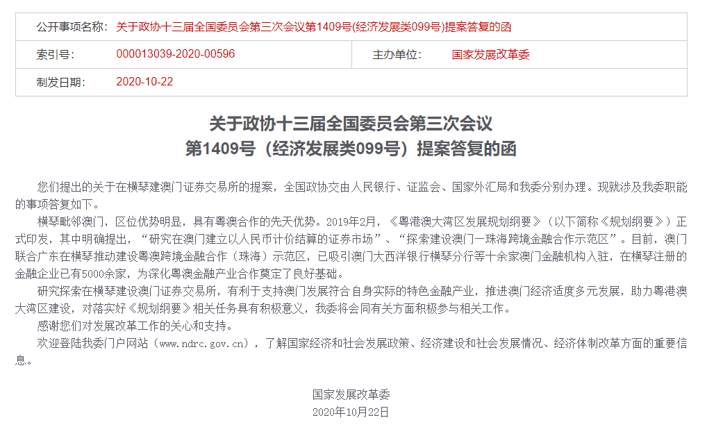 答復(fù)明確表示,研究探索在橫琴建設(shè)澳門證券交易所。“我委將會同有關(guān)方面積極參與相關(guān)工作。”