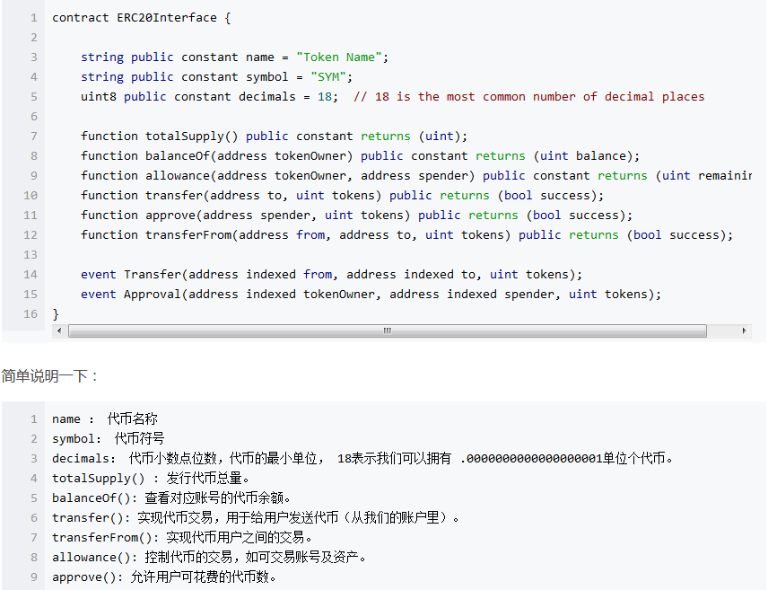 這邊還要介紹下ERC20,ERC20是以太坊定義的一個(gè)代幣標(biāo)準(zhǔn)。該標(biāo)準(zhǔn)要求我們?cè)趯?shí)現(xiàn)代幣的時(shí)候必須要遵守的協(xié)議,只有支持了協(xié)議才能被以太坊錢(qián)包支持。下面是協(xié)議代碼接口,看不懂沒(méi)關(guān)系,找個(gè)程序員都能搞定。