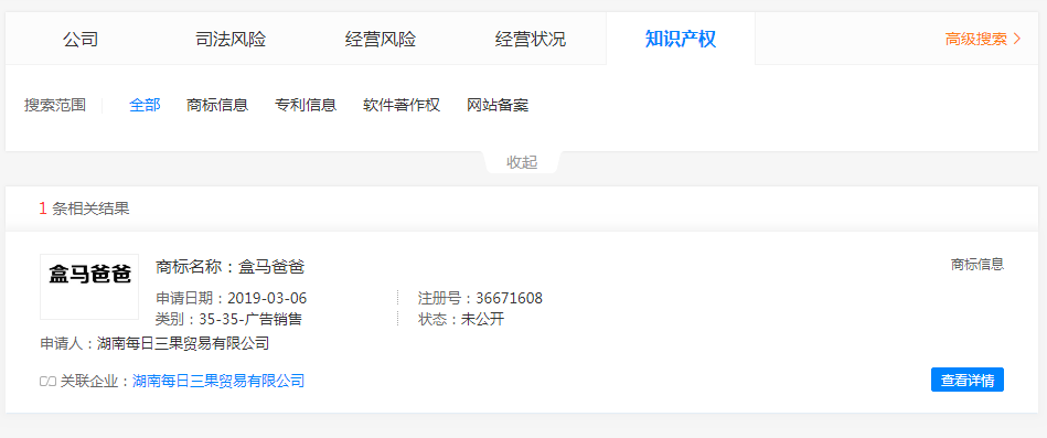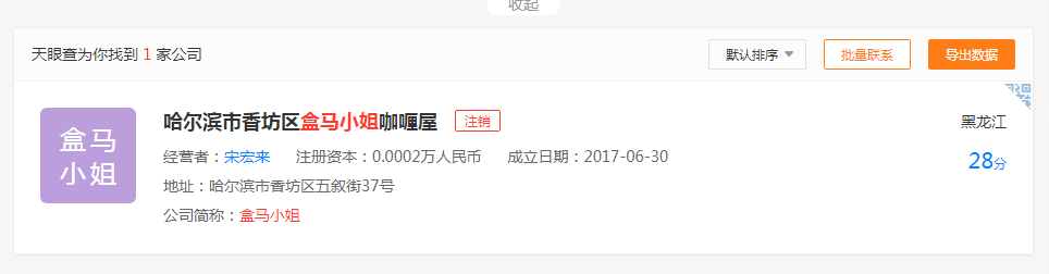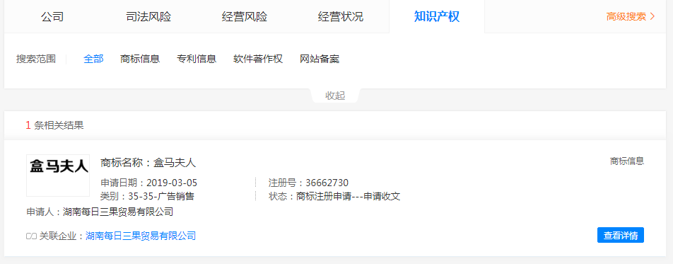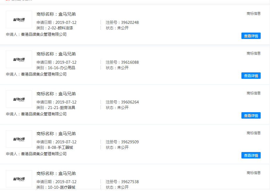 我們通過(guò)天眼查發(fā)現(xiàn),“盒馬夫人”、“盒馬爸爸”都是湖南每日三果貿(mào)易有限公司注冊(cè),“盒馬兄弟”商標(biāo)持有人是香港品牌集眾管理有限公司,“盒馬小姐”持有者是哈爾濱市香坊區(qū)盒馬小姐咖喱屋,目前該公司顯示已注銷(xiāo)。